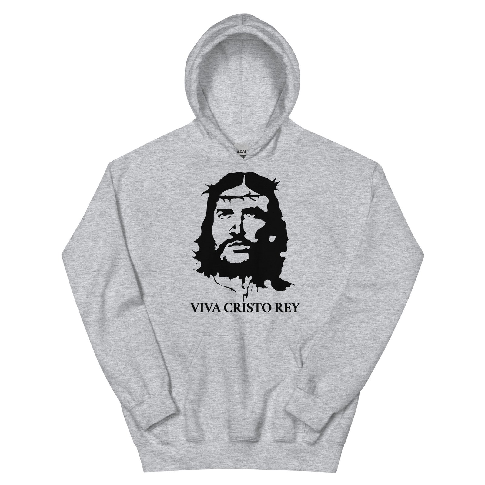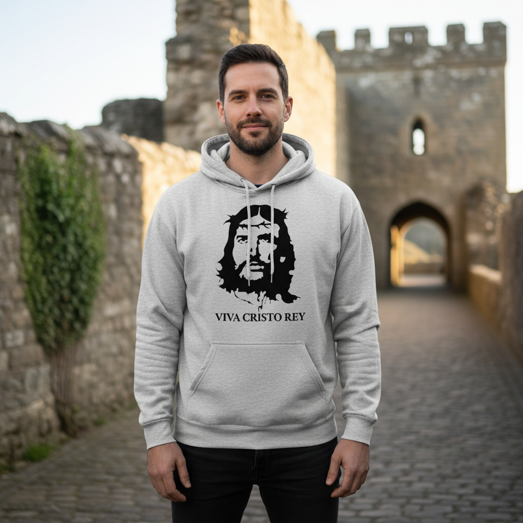 Bold, iconic, and full of faith — our Viva Cristo Rey hoodie features a striking graphic of Jesus in the style of revolutionary art. Make a statement of devotion with this comfortable, everyday tee.